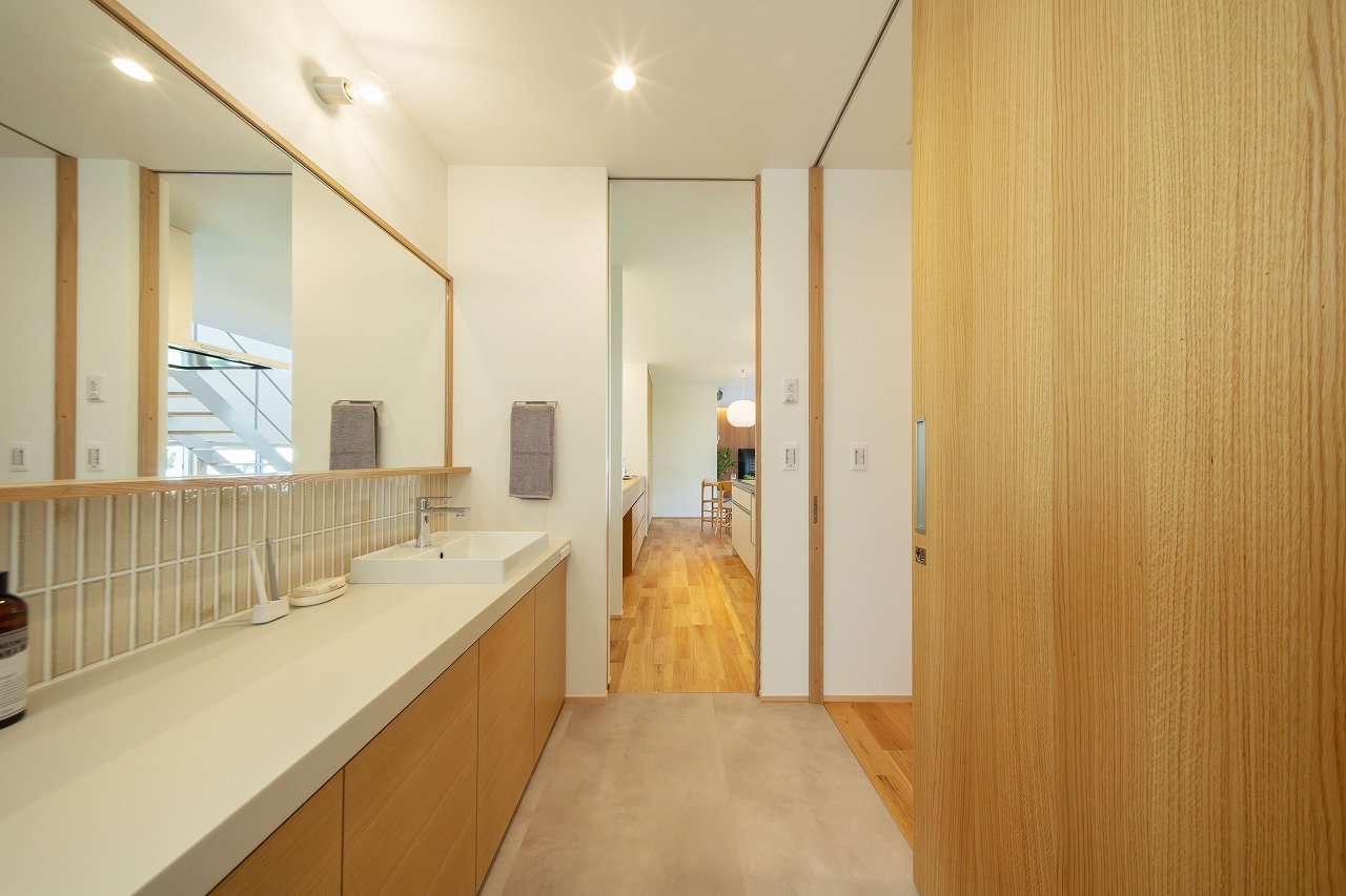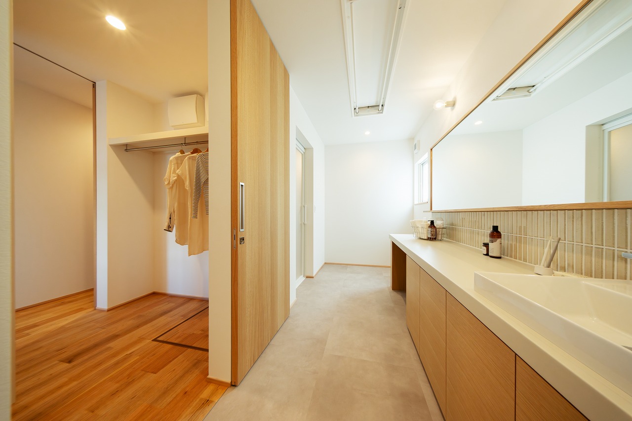 キッチン横から、洗面・ランドリールーム・クローク・LDKへと回遊できる家事動線。