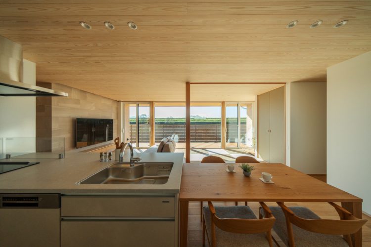 大開口の窓の先には、深い軒に守られたウッドデッキを配置。将来BBQを楽しむ予定のお庭へと緩やかに繋がります。 特にキッチンからの視線の抜けが心地よく、四季の移ろいやお子さまが遊ぶ姿を眺めながら、料理の時間も楽しめる設計です。