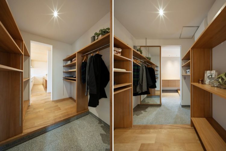 「買い物から帰って、すぐにキッチンへ行きたい」 そんな奥様のご希望から、玄関・脇玄関・パントリー・キッチンを最短で結ぶ“裏動線”を計画しました。 買い物帰りの重い荷物もすぐに片付き、毎日の家事がスムーズに続く動線です。