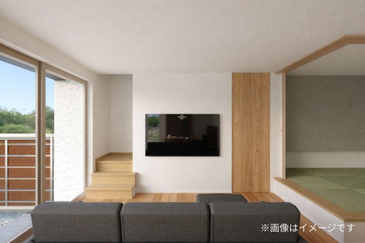 リビングの一角には、小上がりの畳スペースも。 段差に腰掛けてお庭を眺めたり、ゴロンと横になってくつろいだり。思い思いのスタイルでリラックスできる、家族団らんの中心です。