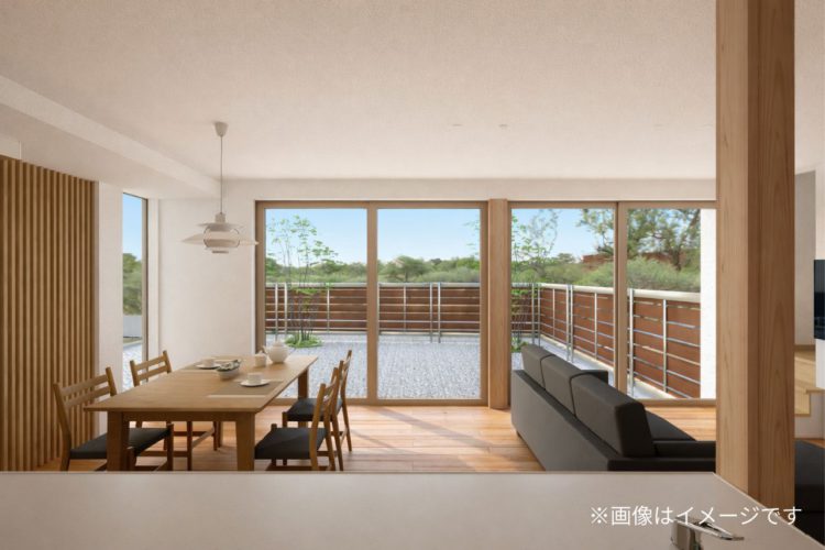 明るい光を取り込む大開口LDK。窓を開ければテラス、そしてお庭へとフラットにつながり、元気に駆け回るお子さまの姿をリビングから穏やかに見守れます。
