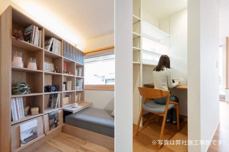 LDKのすぐ隣に、家族でシェアできる造作の本棚とデスクを設けた「おこもり空間」を。 お子様が絵本を読んだり、ご夫婦のワークスペースとして仕事をしたりと使い道は自由自在。 家族みんなが使える、LDKのもう一つの居場所です。