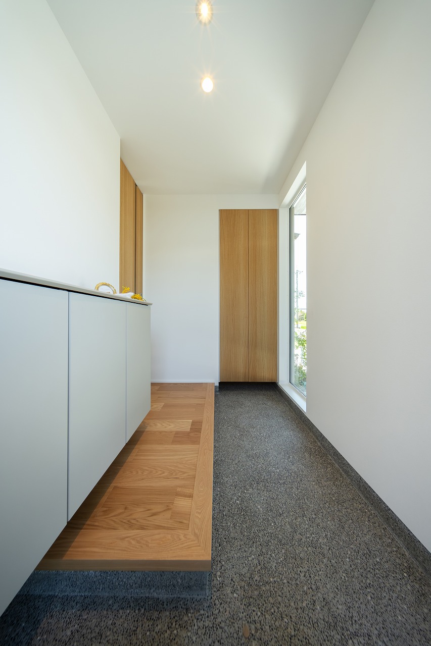 窓から植栽の緑と柔らかな光が差し込む玄関。