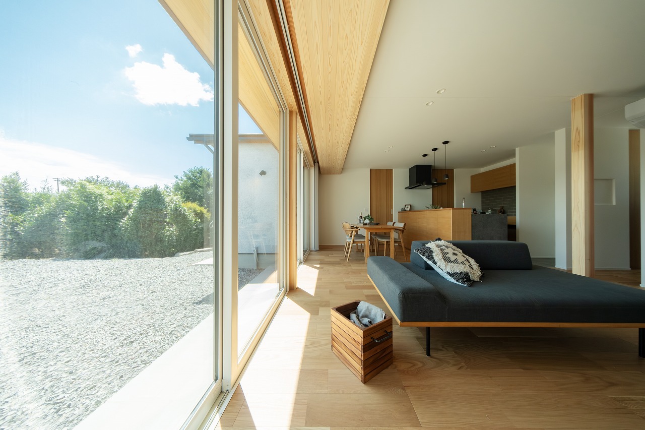 大開口から明るい光が降り注ぐ、陽だまりのようなお住まいです。