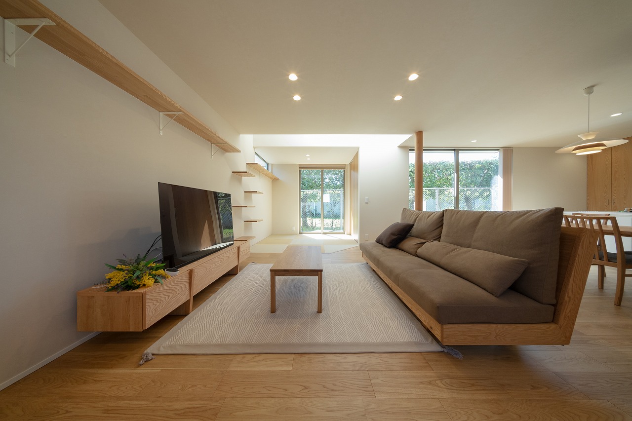 明るく広々開放的なリビングと、シンプルで使いやすい家事動線、優しくあたたかな木の風合いで休日も家で寛ぐことができる、インドア派のご家族にぴったり住まいのが完成。飼っている愛猫のために、リビングにはキャットウォークや高窓を設け、傷のつきにくい素材選びにもこだわりました。